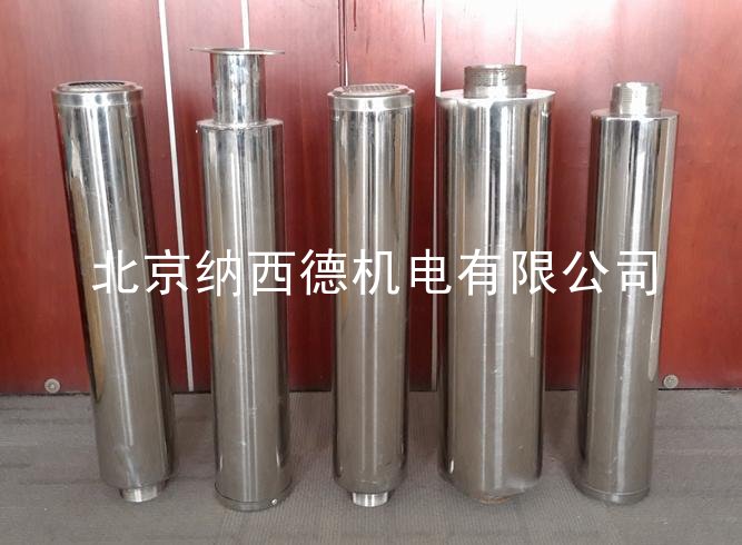 消音器的口徑有1.5寸、2寸,接頭有單向接口,也有雙向接口供選擇。結構中對高頻噪聲和低頻噪聲消聲采用阻抗兩種消聲區(qū),用以最大限度的增寬消聲頻帶。